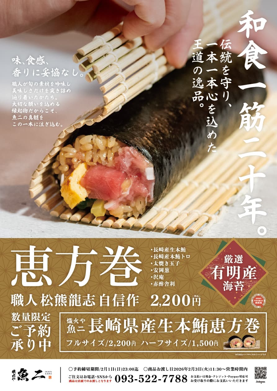 2026年2月3日(火)の節分に向けて、魚二 特選恵方巻きのご予約受付を開始いたしました。
